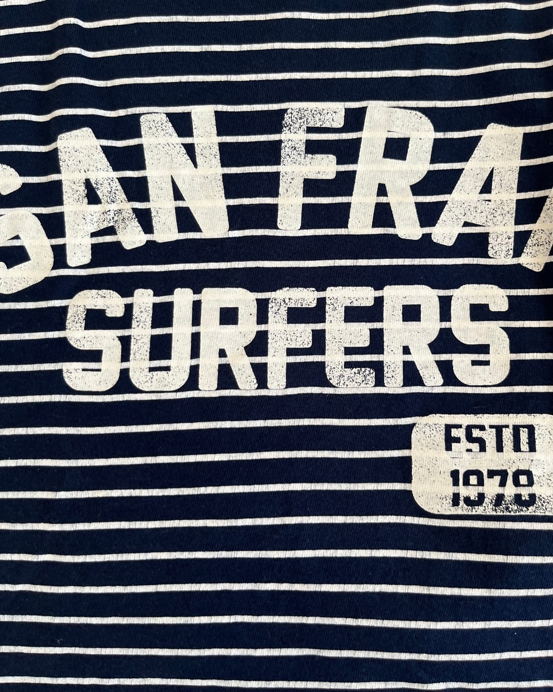 Blue and white striped vest with ‘San Fran Surfers’ logo from H&M