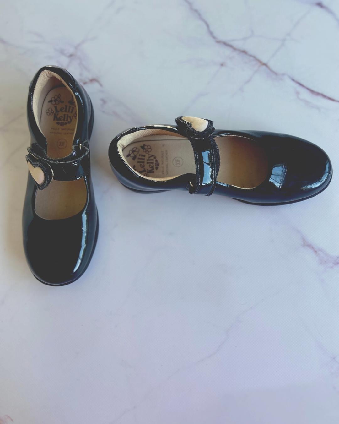 Black patent leather pumps with heart buckles from Italian brand, Lelli Kelly.