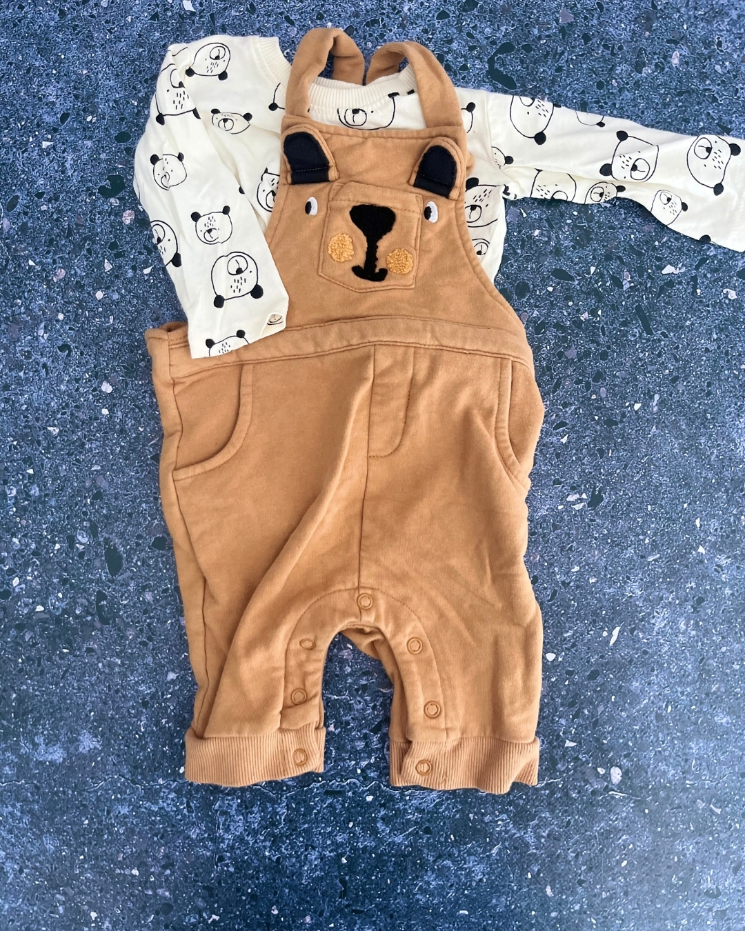 Woolworths white bear top and brown dungarees set 1/3M